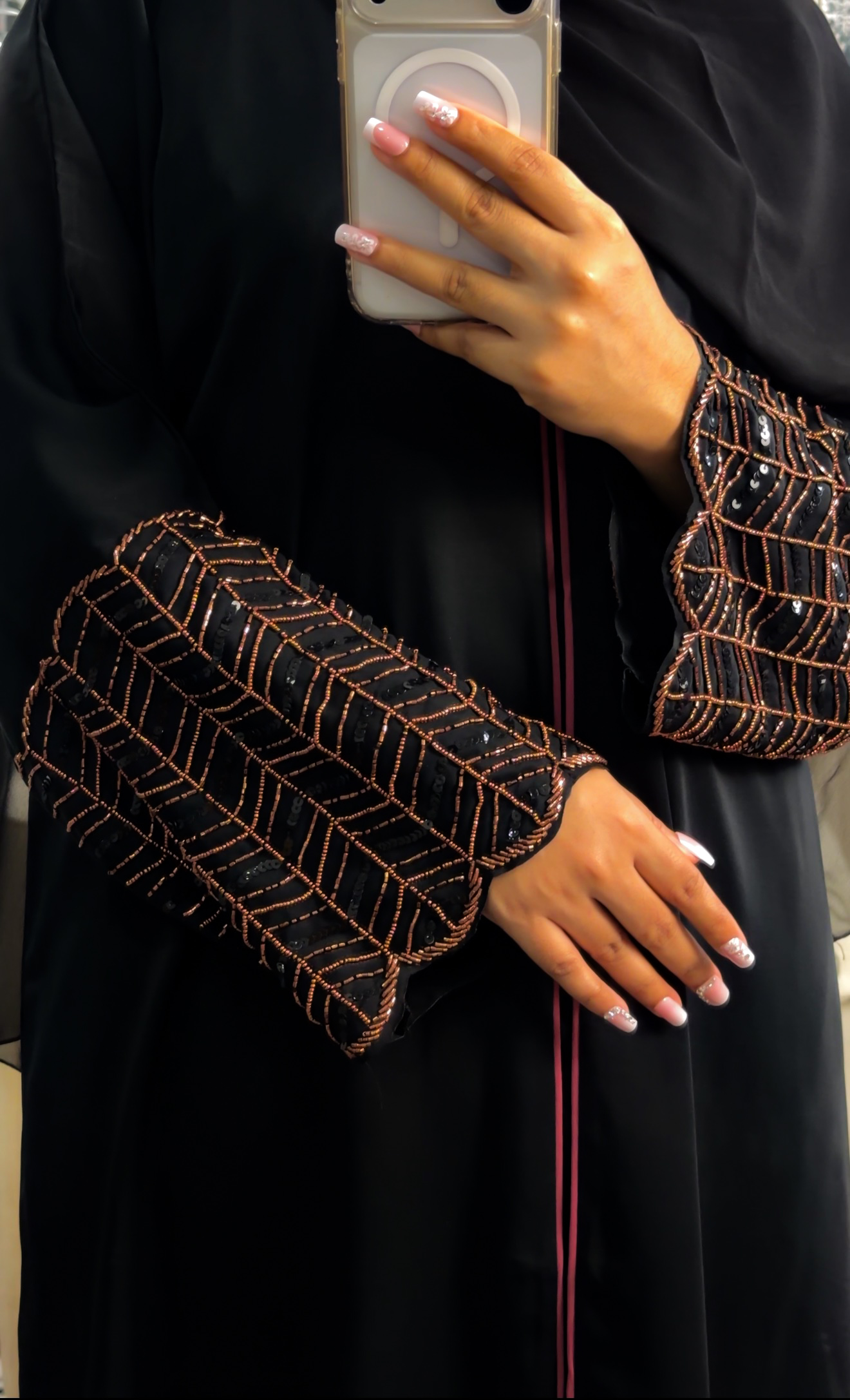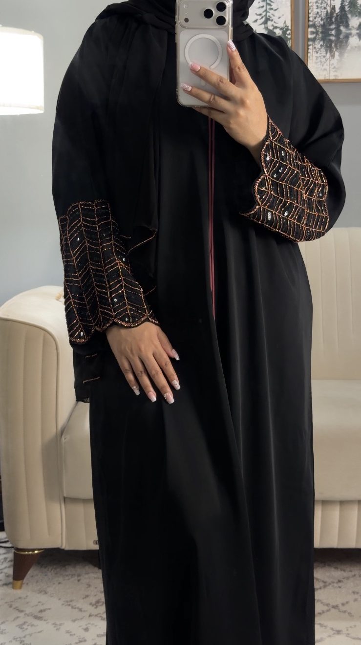 Classic black abaya with a clean, minimal silhouette and delicate handwork on the sleeves. The signature feature of this abaya is its intricately hand-embellished sleeves, adorned with copper and black geometric embroidery, delicate beadwork. The contrast between the rich black and the shimmering details creates a subtle sophisticated look that feels luxurious yet understated.