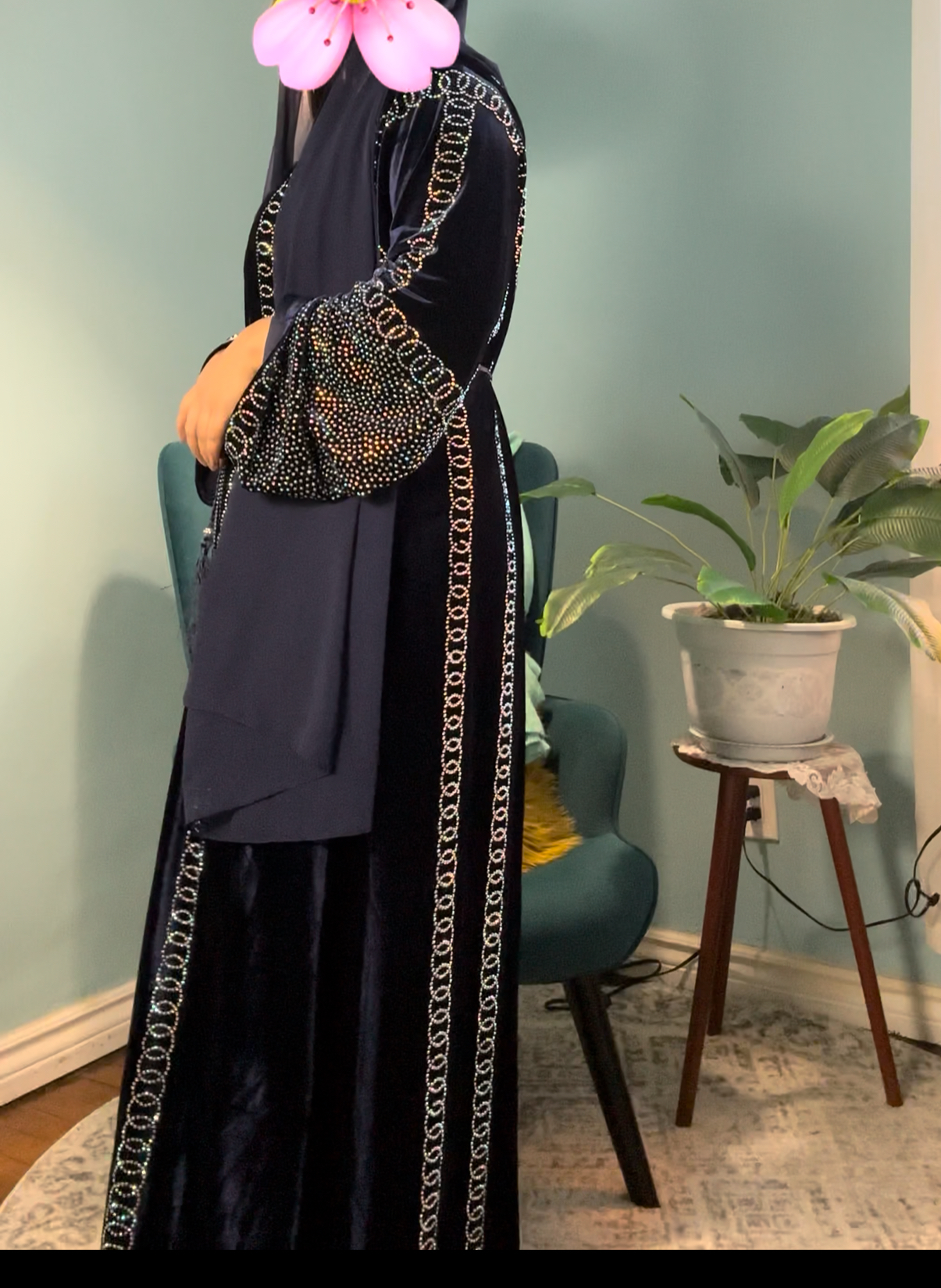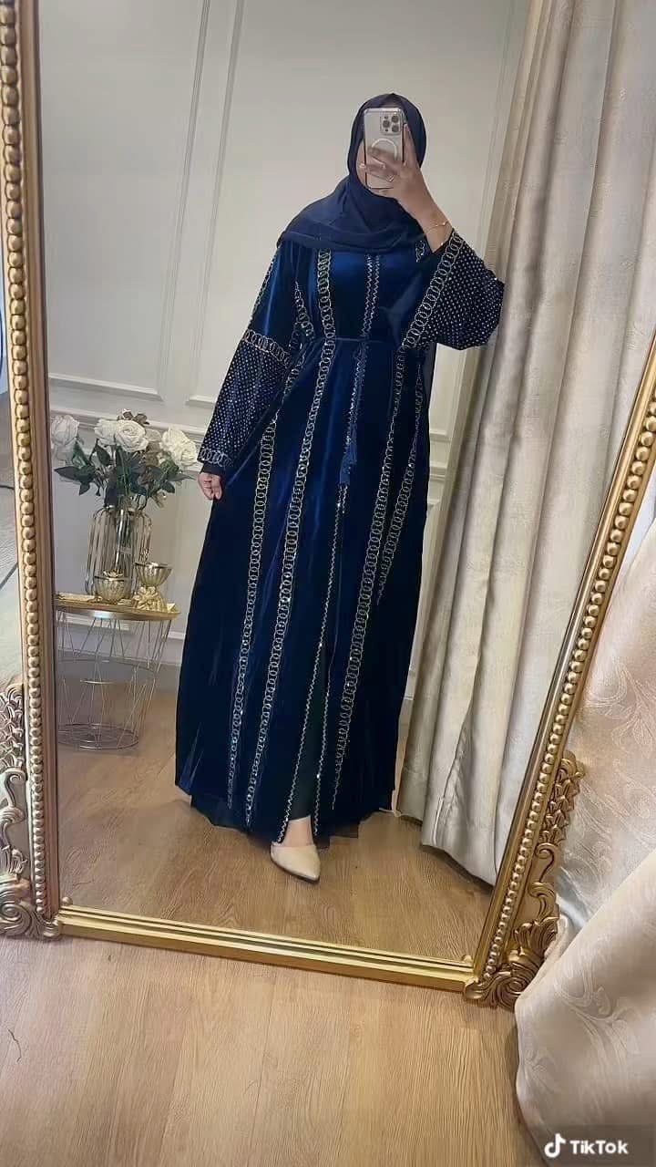 Shiny crystals are hand-embellished onto the luxurious material, creating a dazzling play of light and enhancing the beauty of the garment. These crystals add a touch of glamour without being overpowering, making it suitable for both daytime and evening wear. The Abaya drapes beautifully, creating a sense of elegance as you walk. The flowing silhouette is both graceful and comfortable, allowing you to move with ease.
